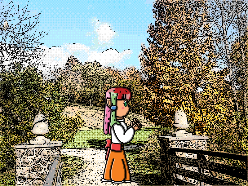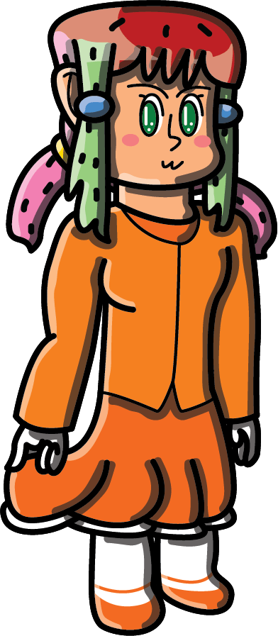 After gathering hair colors commonly used on popular anime characters, comparing those colors on TVs that were available in the 1980s, and by placing her on various backgrounds to see what worked and what didn’t, she told me to go multicolor on it. This led to her top and bangs being red, her sidelocks being lime green, and the back being pink (ah, my God, why did you make me do this?).