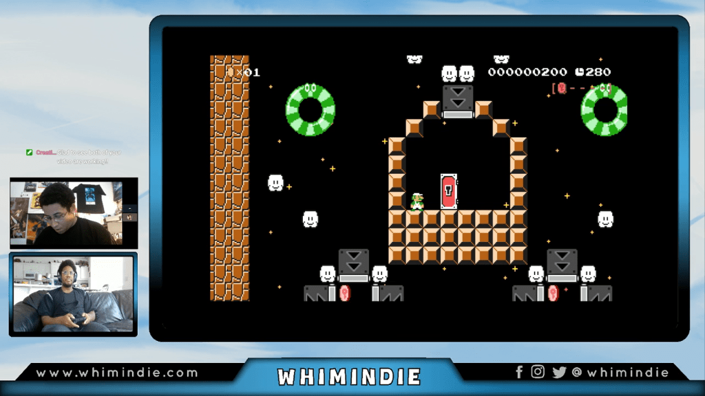 On Friday, May 8, 2020, Twitch streamer @whimindie did a livestream of various Mario Maker courses requested by fans. Two courses by Drillimation Systems were featured. They were both multiplayer co-op courses done by players GroverWhim (Mario) and Mizore J (Luigi, transliterated from Japanese).