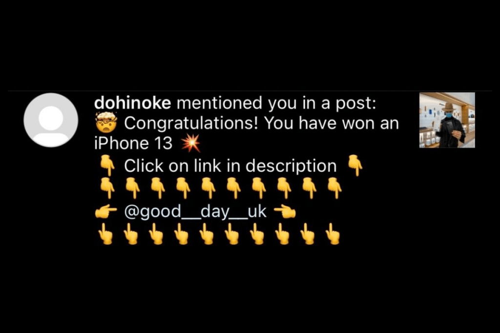 In 2022, lottery and investment scams on Instagram reportedly reached historic highs. This was partly to blame on the then-newly released iPhone 13. Those scammers apparently found a new tactic: tagging a group of users in a regular post or story. If you fall for these or trust them, you could lose big.