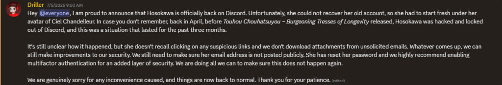 On the day after Independence Day, a miracle happened. While the Prophet was working on a PC-98 remix of the song The Spirit Butterfly Dances Through the Air from Touhou Houtenkyou ~ Treasure Castle Labyrinth when he got a friend request on Discord. He didn’t recognize the name at first until it took him seconds to realize that it was Hosokawa. After getting locked out of Discord for nearly three months earlier this year in mid-April in the weekend before Touhou Chouhatsuyou ~ Burgeoning Tresses of Longevity released on Steam, Hosokawa finally returned to Discord.