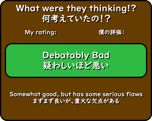This product belongs to the “Very High” category of the AVGN Scale because it’s an assault on the eyes. Between the traced artwork and the backgrounds that are so bright to the point of giving you a migraine, it’s practically unplayable. The broken scoring math makes the entire danmaku experience feel pointless.