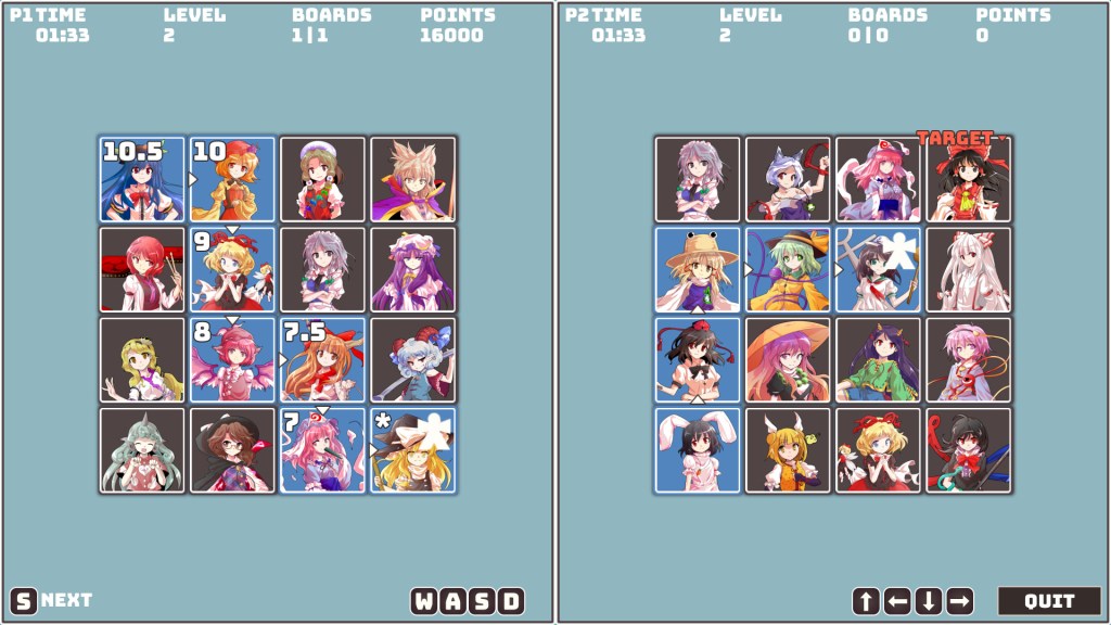 If the base game isn’t giving you enough of a headache, you can toggle the “grow board” option in the setup menu. Every five times you find the perfect path, the board gets bigger. More rows, columns, and opportunities to realize you’ve forgotten which game some obscure midboss first appeared in. There’s even a VS Mode so you can drag a friend into this trivia-fueled challenge to see who knows their knowledge from Touhou 6 to Touhou 18 faster. It’s a test of mental fortitude that will make you wish you were just dodging danmaku instead.