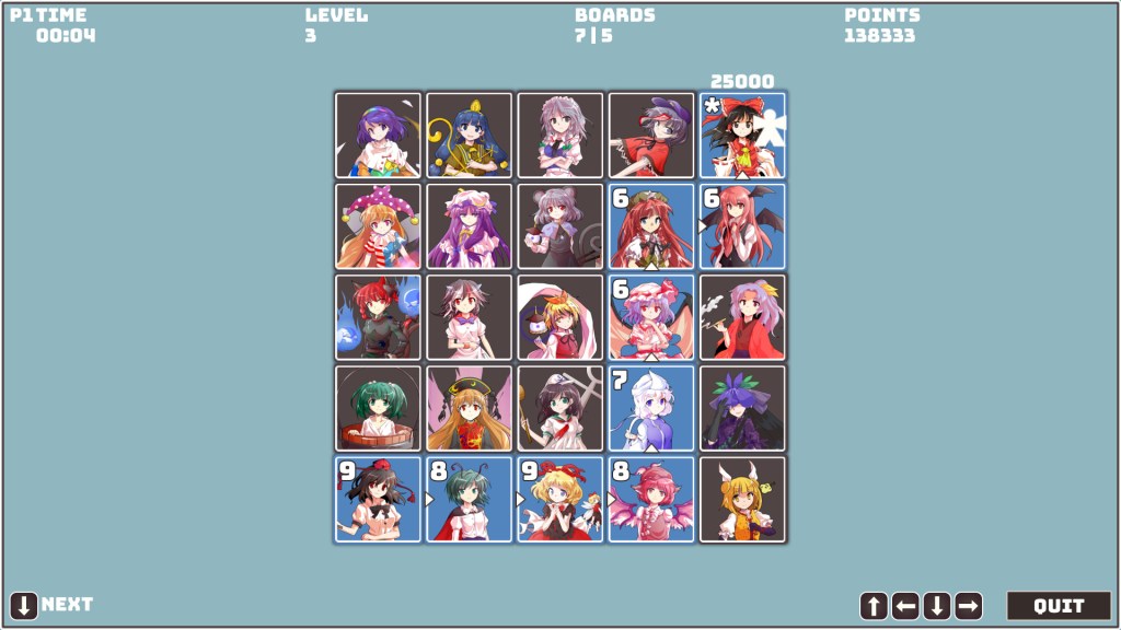 If you move from a Touhou 7: Perfect Cherry Blossom character to another character from the same game, that’s a low cost. Moving from that game to Touhou 6: The Embodiment of Scarlet Devil or Touhou 8: Imperishable Night? Still okay. But try to jump from Touhou 6 to Touhou 18: Unconnected Marketeers, and you’re gonna have a bad time. You have to be a literal walking encyclopedia of franchise chronology just to figure out the most efficient route. It’s like taking a history exam while a teal-colored GUI stares back at you. Oh, and guess what you have to do every time you solve a puzzle using the mouse – you have to push the down cursor key just to advance to the next one. Who came up with this?
