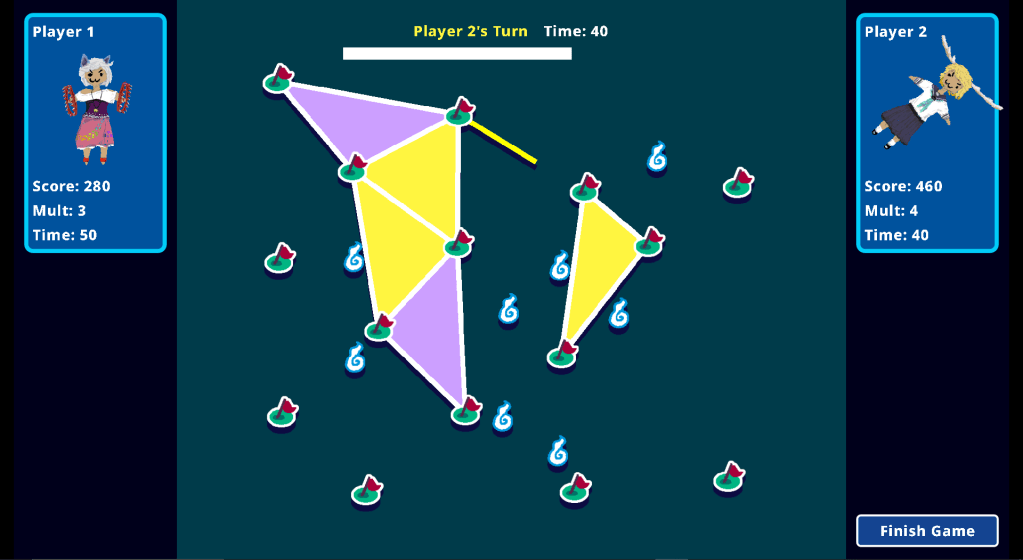 You have to click two flags to make a connection, and if you manage to close a triangle, you capture territory. You’ll be a real estate mogul in a world of spinning beast girls. But wait, there’s a catch – it’s not just about triangles. You’re trying to trap spirits inside these shapes like you’re a ghostbuster with a severe geometry obsession. And if you capture a flag that’s already part of someone else’s territory? Everything they built disappears! It’s absolute chaos!