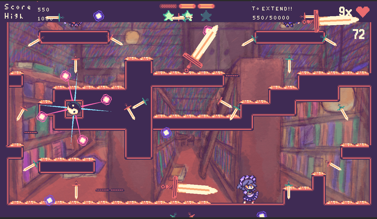 You play as Sakuya Izayoi, the head maid of the Scarlet Devil Mansion, who apparently didn’t get the memo that spring cleaning usually involves a vacuum and some Windex, not jumping over glowing balls of death while flying through a library. The goal is to clean up dust clumps, though the controls feel like you’re trying to maneuver a shopping cart with one locked wheel through a field of landmines and danmaku.